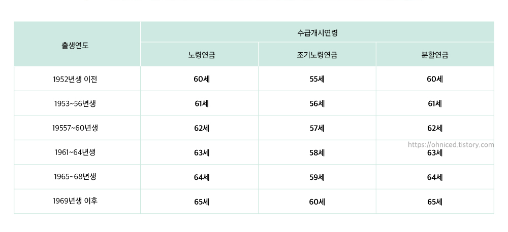 2023년도 국민연금 수령나이는 출생연도에 따라 다릅니다. 1952년생 이전 출생자는 기존처럼 60세에 노령연금을 수령할 수 있습니다. 1953년 출생자 이후부터는 3년 단위로 수령나이가 1세씩 늘어납니다.