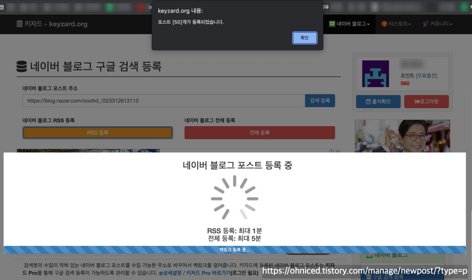 RSS 등록은 최근 50개의 포스트를 한번에 등록하며, 1일 1회 무료로 이용 가능하고,