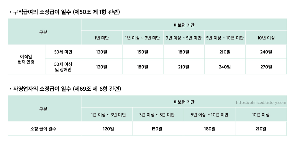 실업일 기준 수급자의 연령과 고용보험 가입기간에 따라 120~270일간