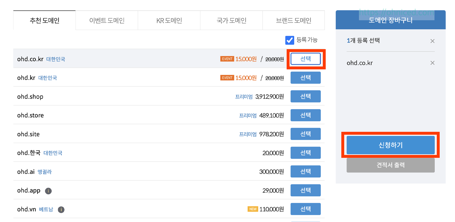 이 중에서 대한민국 co.kr이나 kr 또는 com을 골라 선택 해주세요.