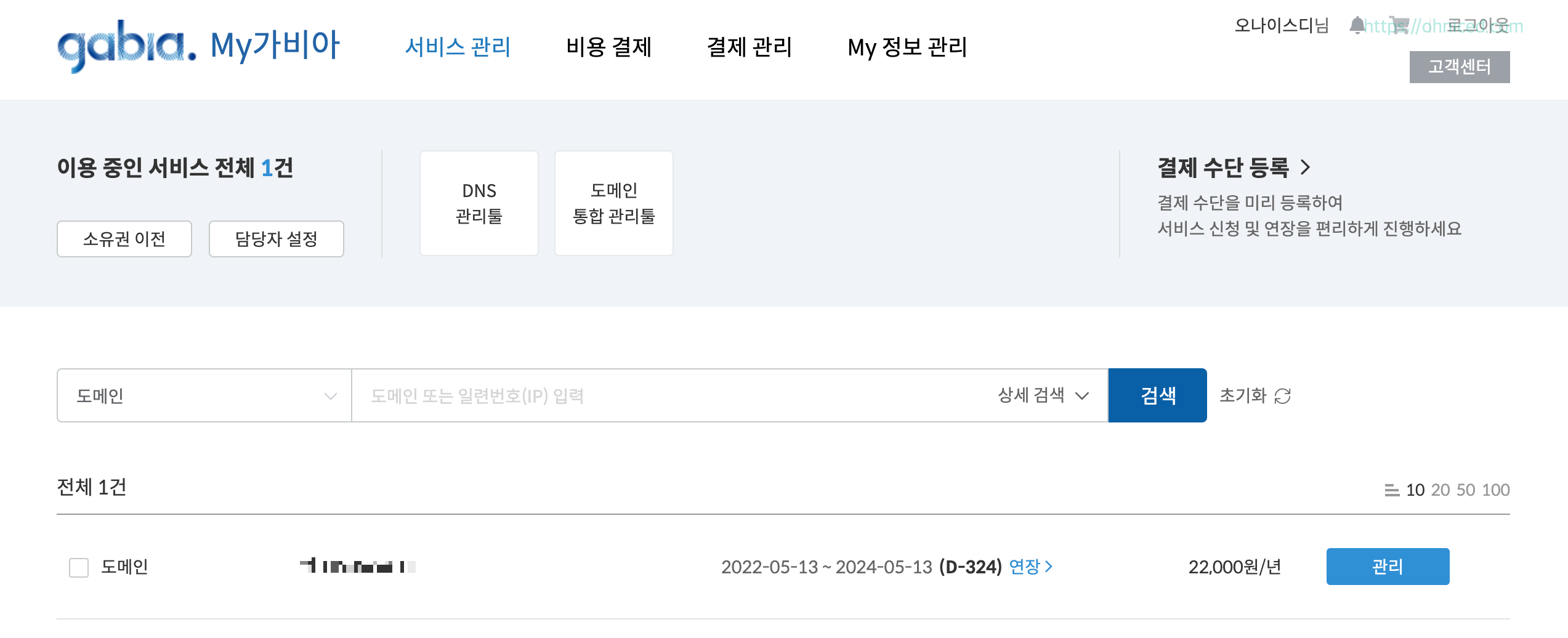 메인 우측 상단에 My가비아를 눌러 도메인이 생성된 걸 확인할 수 있습니다.