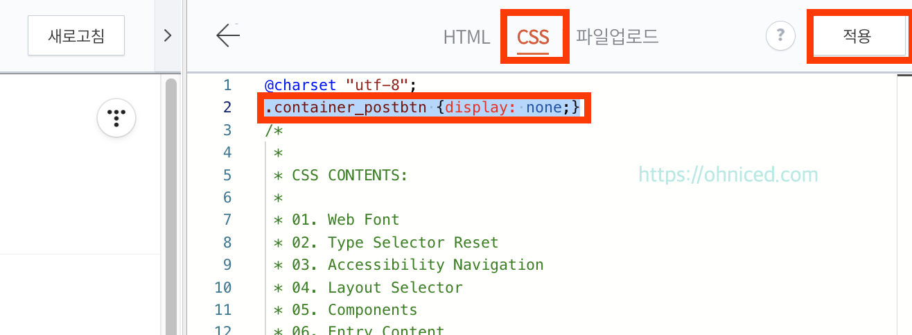 2번째 줄 ->. container_postbtn {display:none;}  -> 적용 -> 새로고침 눌러줍니다.