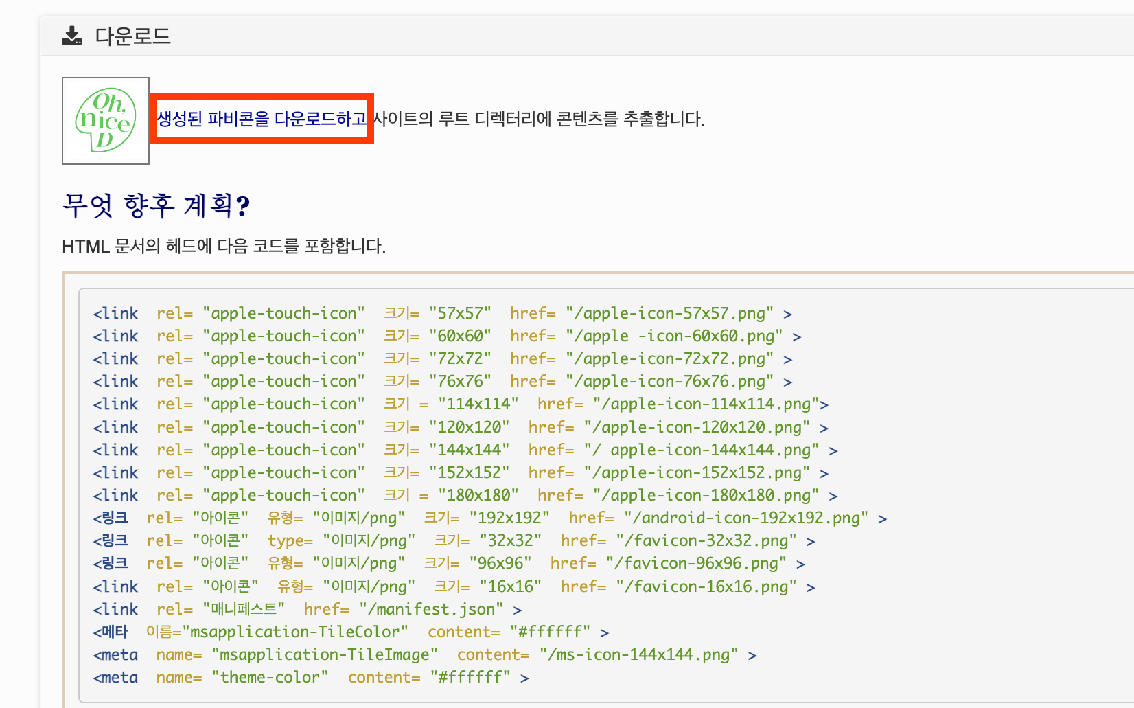 1. 파비콘 목록으로 체크 -> 파일 업로드 -> 다운로드해줍니다.