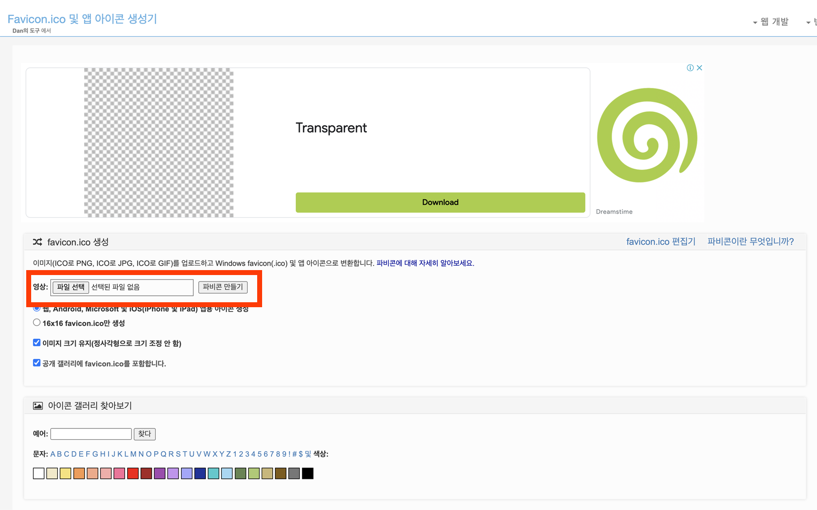 취향에 맞는 사이트에 들어가셔서 파비콘과 아이콘을 만들어주세요.