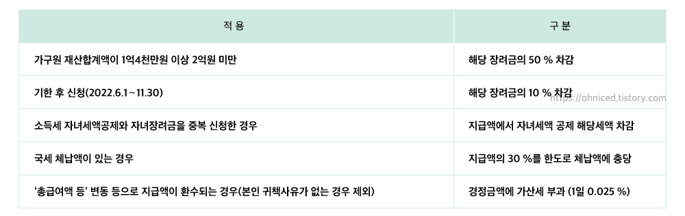 자신의 자격요건 대상에 포함되는 기준금액에서 구분에 따라 장려금이 차감될 수 있는데 해당 내용은 다음과 같습니다.