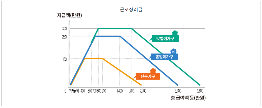 일하는 소득으로는 생활이 어려운 근로자, 사업자 가구에 대해 가구 및 소득별 지원금을 지급해주면서 근로를 장려하고 있습니다.