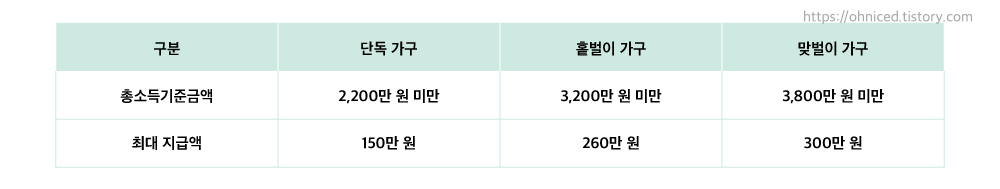 가구 유형에 따라 지급 가능액이 나뉘며, 가구 유형에 따라 최대 300만원까지 지원받을 수 있습니다.