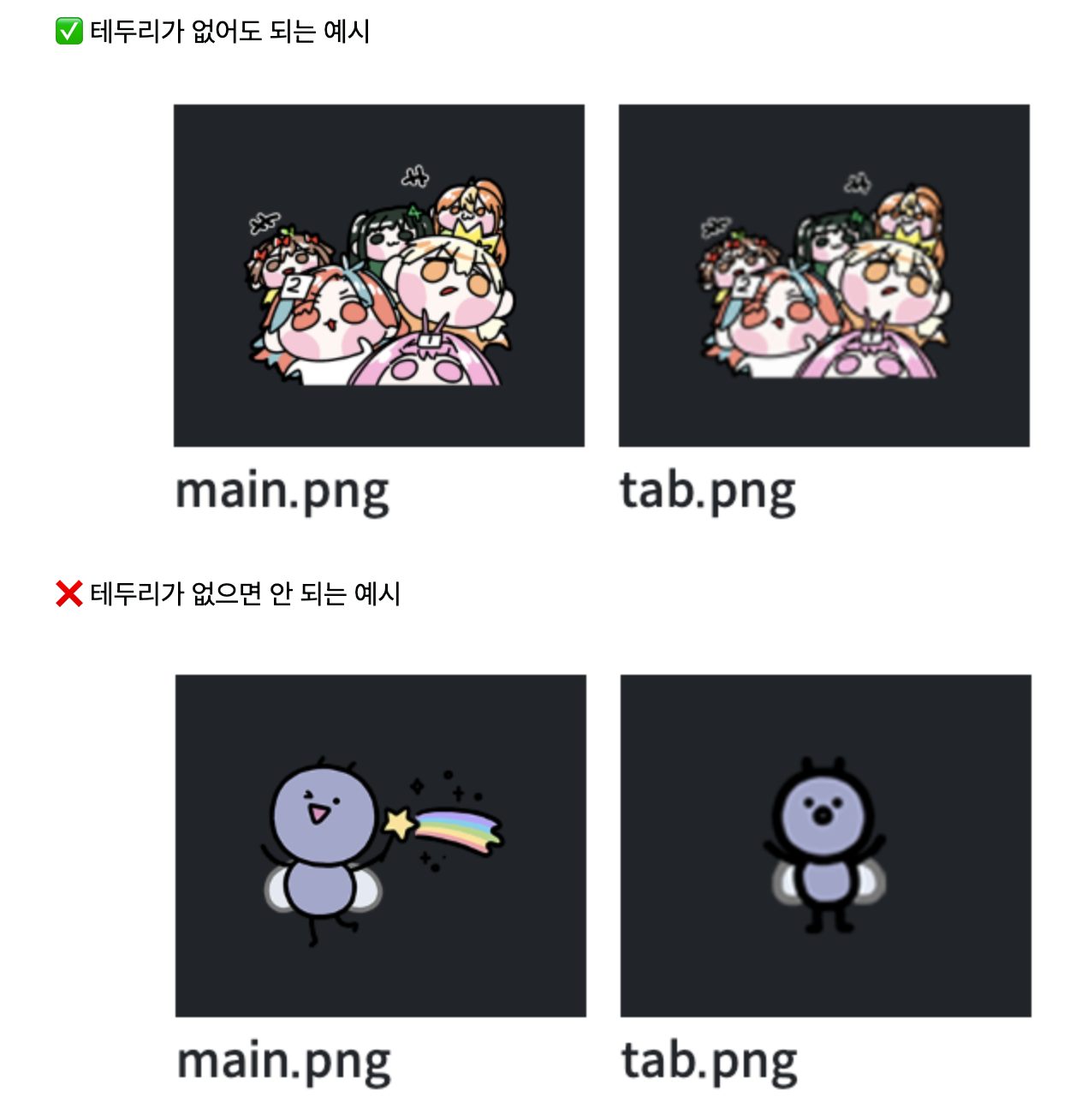 캐릭터/형태에 대해 테두리가 없어도 가독성에 문제가 없을 경우에만 심사가 통과되지만,