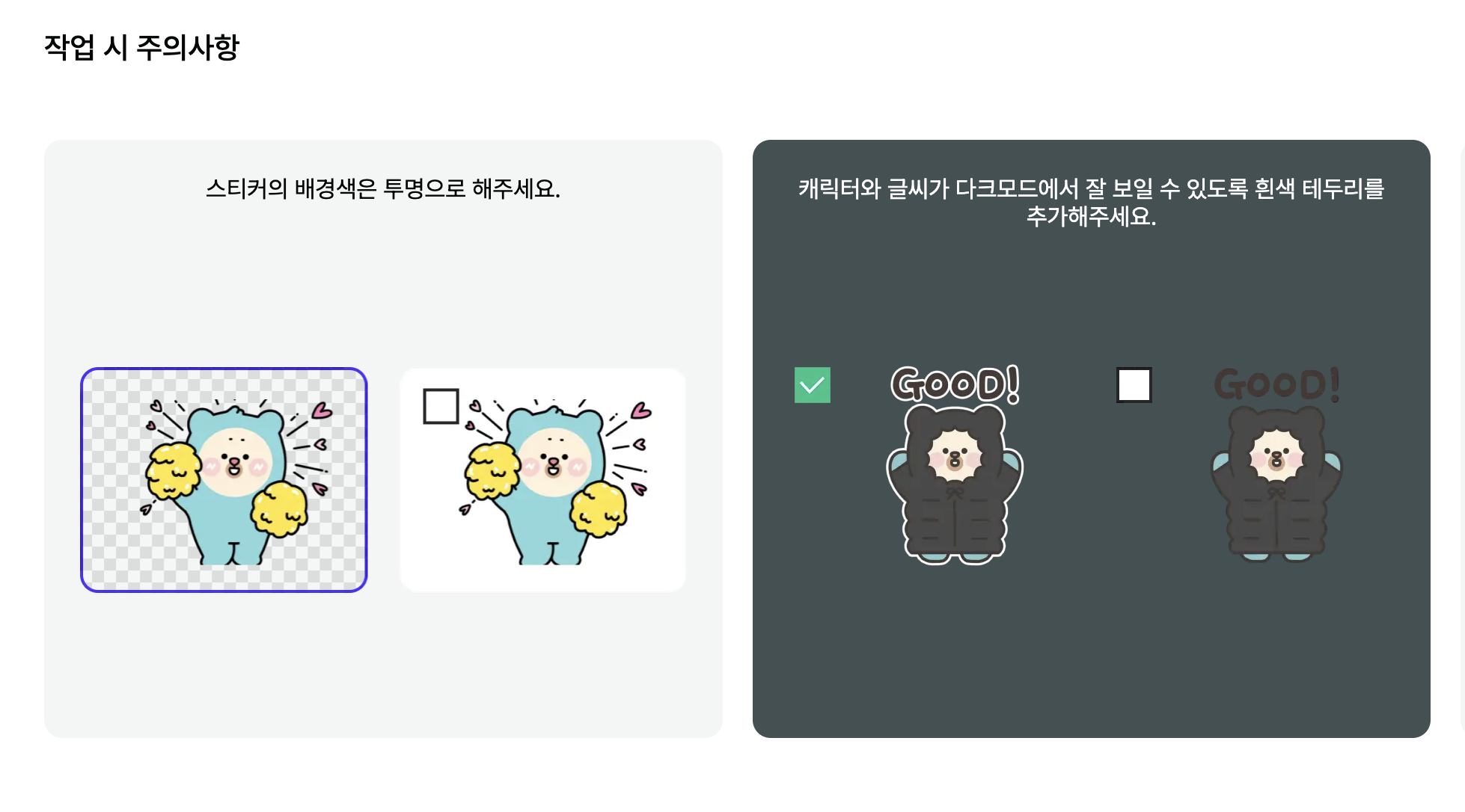 캐릭터의 색상 자체가 어둡고 가독성에 문제가 있을 경우 흰테두리를 필수로 해야한다고 설명합니다.