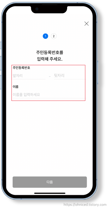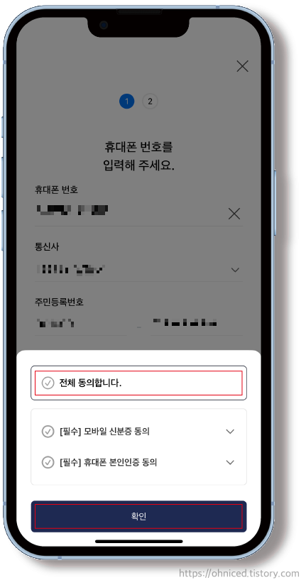 개인정보 입력 -> 휴대폰 번호 입력 -> 전체동의 -> 인증번호 입력 -> 확인을 눌러줍니다.