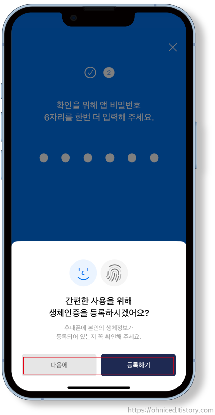 비밀 번호 6자리 -> 생체인증 등록을 할 것인지 설정해줍니다.
