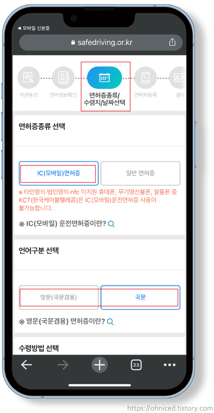 운전증 발급 종류(IC 면허증)와 수령지(시험장 or 경찰서), 수령날짜를 설정해줍니다.