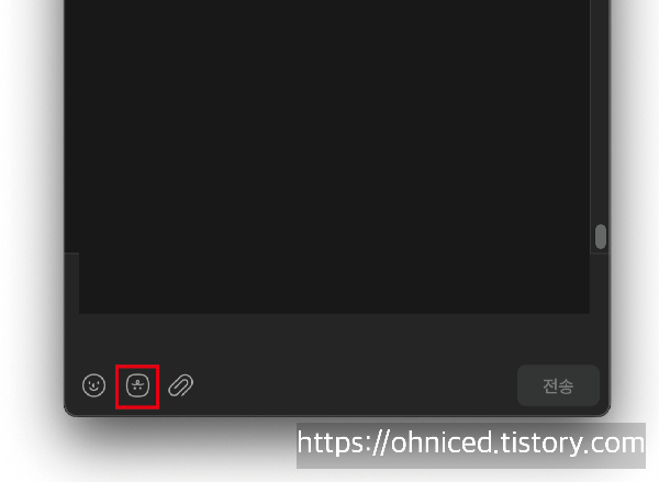 보내고자 하는 톡방에 들어간 후, 톡방 좌측 하단에 죠르디 도구를 눌러줍니다.