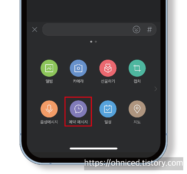 채팅방에서 + 버튼 누른 후 > 예약 메시지 버튼을 눌러줍니다.